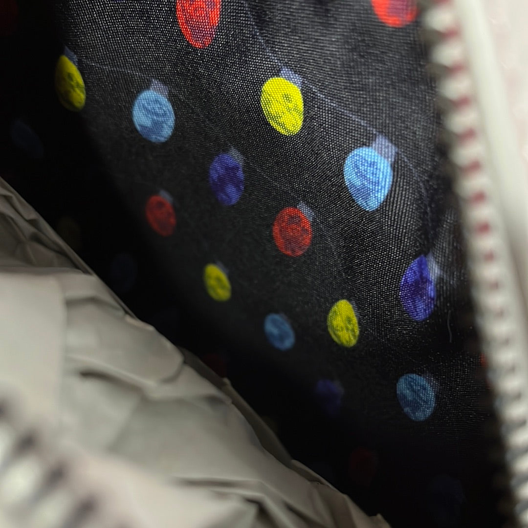 Features side pockets, zipped main compartment with Vampire Teddy zipper pull, adjustable straps and christmas light printed lining. This bag has no front zipper pocket.