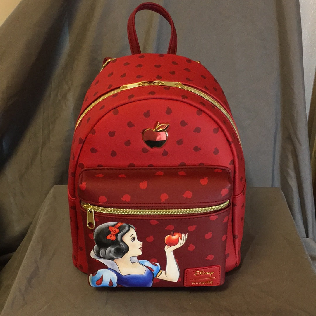 Hard to find Loungefly Snow White mini backpack, red with gold apple emblem on front. Print has Snow White holding an apple on the front and small apples all over.